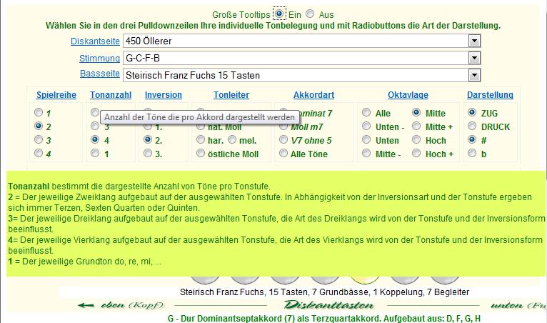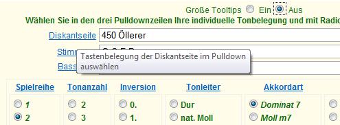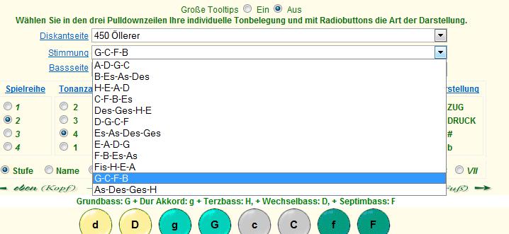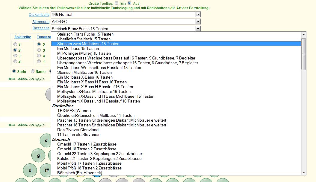 Verwenden Sie den Rollbalken und klicken Sie anschließend auf den gewünschten Eintrag. Es stehen alle Modelle die von der Firma Öllerer und Strasser gefertigt werden zur Auswahl. Die Nummern wie 450 stehen für 4 = vier Reihen 50 = fünfzig Knöpfe, 333 = 3 Reihen + 33 Knöpfe. Auch weitere Modelle stehen zur Auswahl. Zu Vergleichszwecken finden Sie auch eine dreireihige Belegung ohne Gleichton und das chromatische System in B- und C- Griffanordnung, jedoch ohne Wiederholungsreihen vier und fünf.