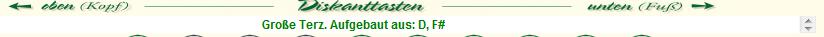 Durch Anklicken der blauen Pfeile auf den Tasten erklingt der zugehörigen Ton. Funktioniert mit Adobe® Flash® Player. Pfeile erscheinen nur auf den Tasten die bunt dargestellt werden. Durch die Vorwahl bei "Akkordart" "alle Töne" und "Oktavlage" "alle", kann man jedem Knopf aktivieren.